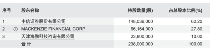 第一大股东为中信证券,持股比例为62.2%;第二大股东为外资机构MackenzieFinancialCorporation(迈凯希金融公司),持股比例为27.8%;天津海鹏科技咨询有限公司为第三大股东,持股比例为10%,而天津海鹏的实控人为国内知名私募股权机构春华资本。