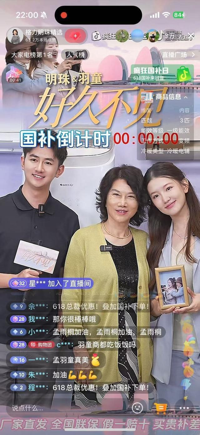当晚21:20左右,直播间关于孟羽童“回归”的对话出现了一段耐人寻味的插曲。当孟羽童表达回到格力直播“非常感慨、熟悉、亲切”,并提及“老板邀请我回来”时,董明珠迅速打断并纠正道:“不是我邀请回来……是因为你那个文章发出来看着挺可怜的,我担心你出什么问题……”