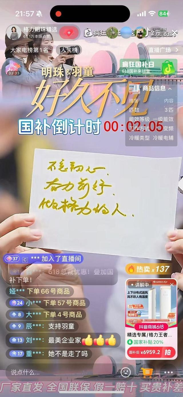 随着直播接近尾声,在孟羽童即将出国留学的背景下,格力方面为孟羽童准备了一份特殊的“小礼物”——一张两人合影的纪念照。董明珠在照片上亲笔写下寄语:“不忘初心,奋力前行。做格力的人。”